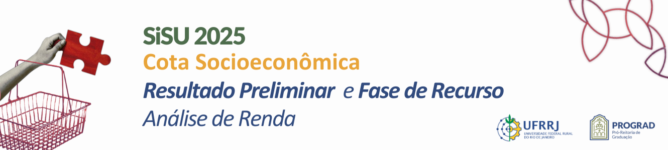 A Pró-reitoria de Graduação torna público o RESULTADO PRELIMINAR do processo de comprovação da Cota Socioeconômica (renda familiar) Ingressantes SISU/UFRRJ 2025.1, nos termos do Edital de Acesso à Graduação nº 01/ PROGRAD/2025 – que se refere a Chamada Regular, 1ª Chamada da Lista de Espera, 2ª Chamada da Lista de Espera, 3ª Chamada da Lista de Espera e 4ª Chamada da Lista de Espera.